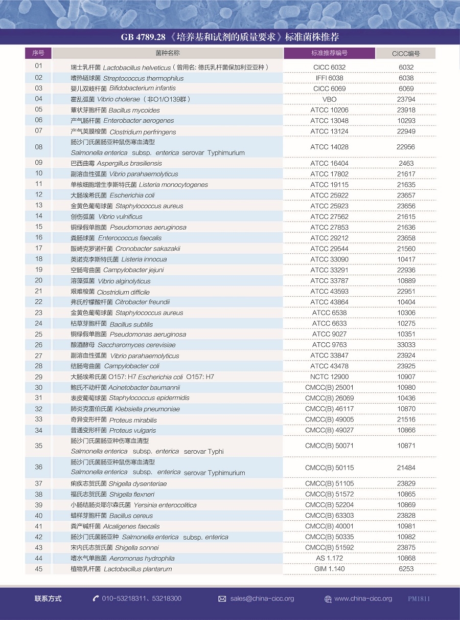 質控菌種:庫藏質控菌株1000余株,廣泛應用于食品、化妝品、環(huán)保、消毒和醫(yī)療機械等領域的微生物學檢驗、質量控制和生產過程控制。