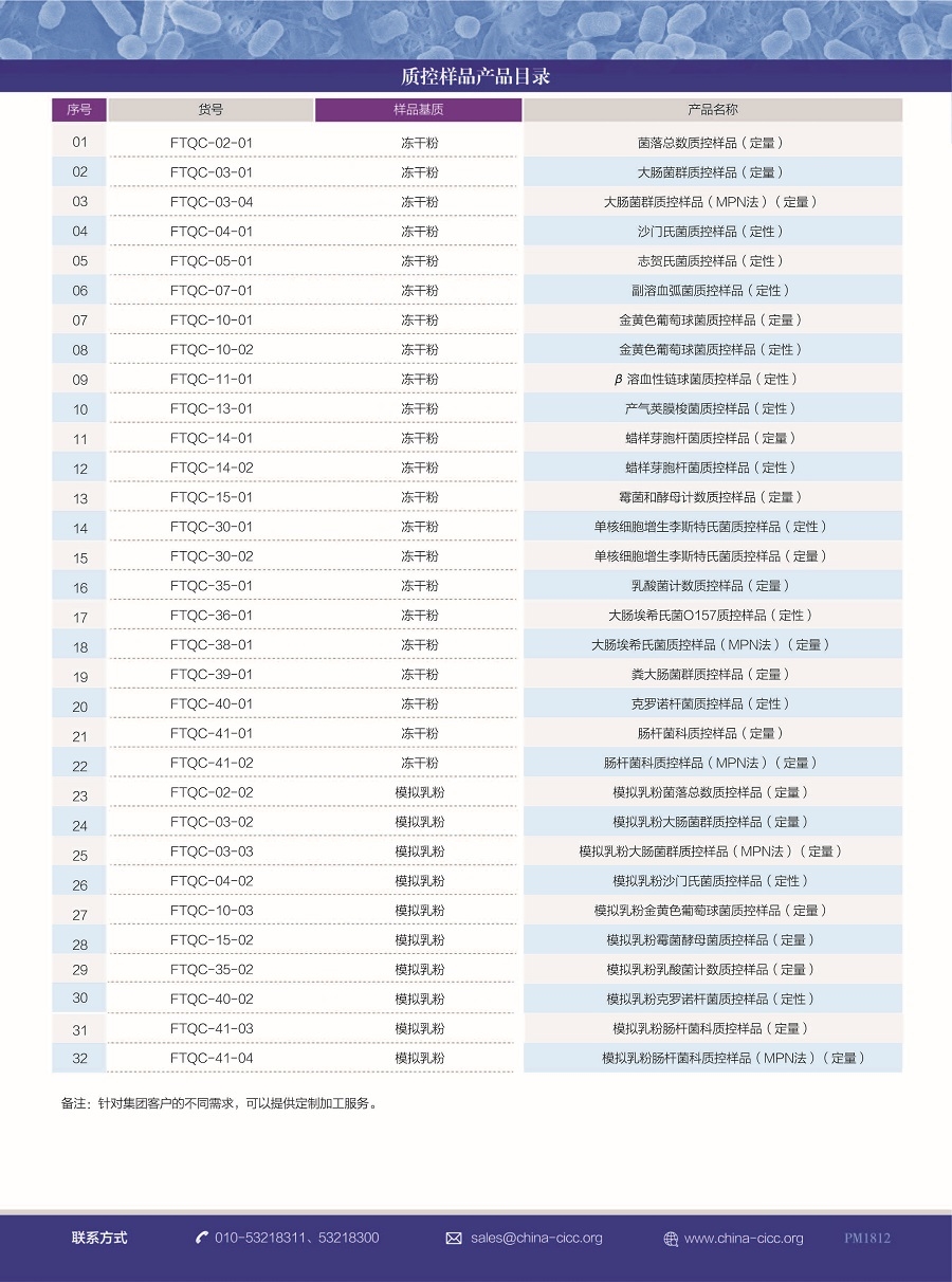 質控樣品:質控樣品是含有一定數(shù)量或特定種類的微生物質控產品。產品包括菌落總數(shù)、糞大腸菌群、大腸菌群、霉菌和酵母計數(shù)、金黃色葡萄球菌等,覆蓋水及水質、食品、公共衛(wèi)生、化妝品等領域。