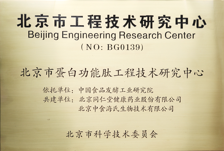 2012年5月,“北京市蛋白功能肽工程技術(shù)研究中心”獲北京市科學(xué)技術(shù)委員會批準(zhǔn)正式掛牌成立。北京市蛋白功能肽工程技術(shù)研究中心是以中國食品發(fā)酵工業(yè)研究院為依托單位,北京同仁堂健康藥業(yè)股份有限公司和北京中食海氏生物技術(shù)有限公司為共建單位,國內(nèi)首個從事蛋白功能肽研發(fā)的科技創(chuàng)新平臺,下設(shè)生產(chǎn)制造中心、基礎(chǔ)研究中心、營養(yǎng)支持與評價中心。中心從基礎(chǔ)研究、工藝與工程化研究、產(chǎn)品研發(fā)、功能性研究、功能性成分分離鑒定和營養(yǎng)支持與評價等方面全方位為客戶提供系統(tǒng)化服務(wù)。中心涉及領(lǐng)域涵蓋天然蛋白資源綜合利用、食源性功能肽研制、體外功能評價、功效成分結(jié)構(gòu)鑒定、肽類終端產(chǎn)品開發(fā)、工業(yè)化生產(chǎn)技術(shù)研究、產(chǎn)品技術(shù)標(biāo)準(zhǔn)建立,旨在構(gòu)建面向農(nóng)產(chǎn)品加工、食品工業(yè)及傳統(tǒng)醫(yī)藥等行業(yè)的天然蛋白資源的深度加工、高值利用技術(shù)研發(fā)平臺,實(shí)現(xiàn)低值農(nóng)林資源的高值化利用,促進(jìn)我國傳統(tǒng)醫(yī)藥、營養(yǎng)保健食品的升級換代。