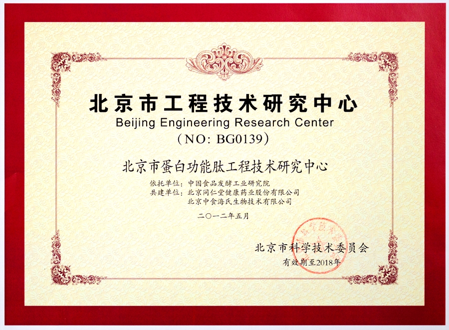 2012年5月,經北京市科學技術委員會批準“北京市蛋白功能肽工程技術研究中心”正式掛牌成立。北京市蛋白功能肽工程技術研究中心是以中國食品發酵工業研究院有限公司為依托單位,北京同仁堂健康藥業股份有限公司和北京中食海氏生物技術有限公司為共建單位共同組建,國內首個從事蛋白功能肽研發的科技創新平臺,平臺下設生產制造中心、基礎研究中心、營養支持與評價中心。從基礎研究、工藝與工程化研究、產品研發、功能性研究、功能性成分分離鑒定和營養支持與評價等方面全方位為客戶提供系統化服務。中心涉及領域涵蓋天然蛋白資源綜合利用、食源性功能肽研制、體外功能評價、功效成分結構鑒定、肽類終端產品開發、工業化生產技術研究、產品技術標準建立,旨在構建面向農產品加工、食品工業及傳統醫藥等行業的天然蛋白資源的深度加工、高值利用技術研發平臺,實現低值農林資源的高值化利用,促進我國傳統醫藥、營養保健食品的升級換代。